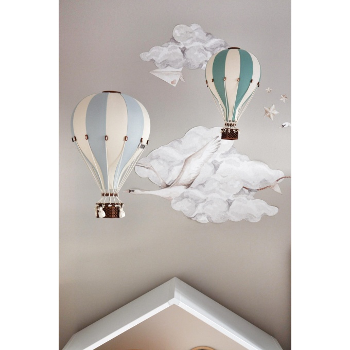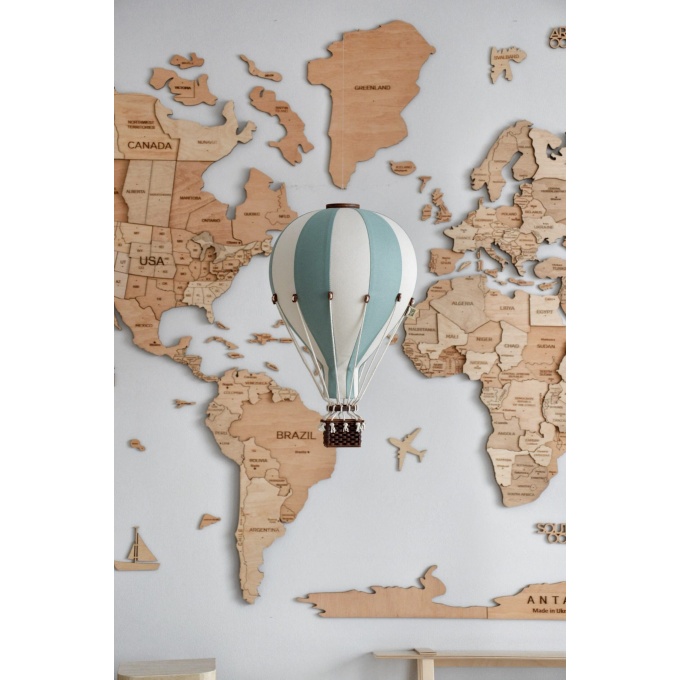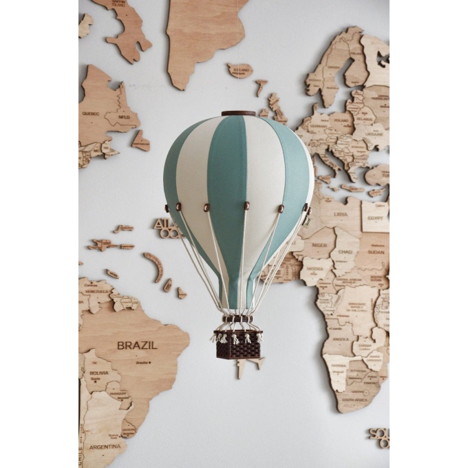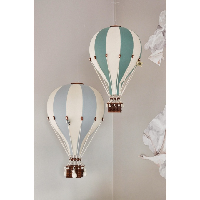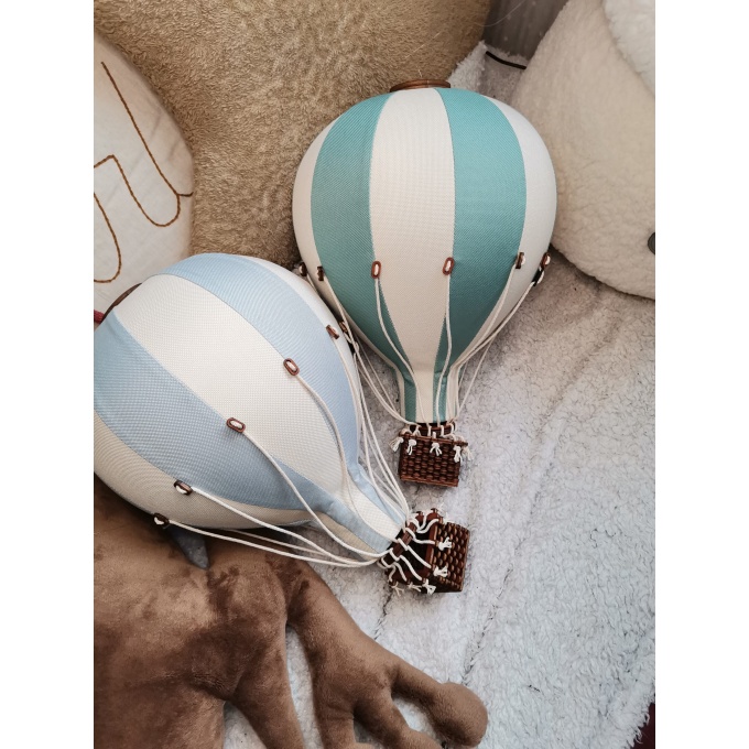 Połączenie wysokiej jakości tkanin, drewna imitującego wiklinę oraz sznurka daje efekt realnie odwzorowanego modelu prawdziwego latającego balonu na podgrzane powietrze. Bogactwo kolorów sprawia, że można dopasować tą dekorację do niemalże każdego rodzaju wnętrz. Czasza balonu wykonana z tkaniny poliestrowej i połączona z gondolą przy pomocy starannie skręconych sznurków.