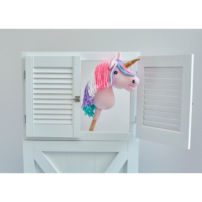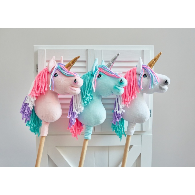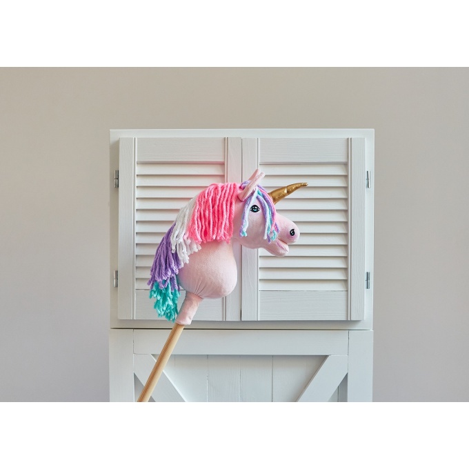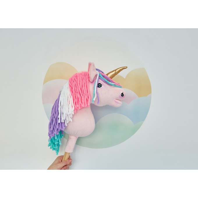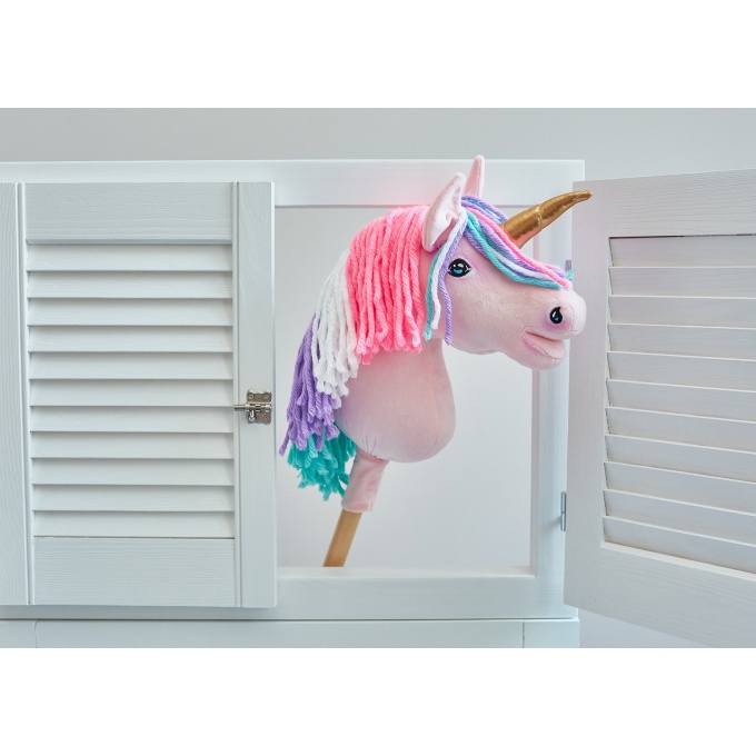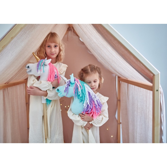 Jednorożec Hobby Horse – ręcznie wykonana zabawka dla dzieci, idealna do zabawy w domu i na zewnątrz. Wykonany z wysokiej jakości materiałów z certyfikatem Oko-Tex Standard, bezpiecznych dla dzieci. Koń uszyty z miękkiego minky, z gęstą grzywą z wełny i akrylu, błyszczącym rogiem oraz ręcznie malowanymi detalami. Wypełniony antyalergicznym włóknem ECO FILLBALL. Osadzony na stabilnym drewnianym kiju bukowym. Całość zapakowana w ekologiczne materiały, gotowa na prezent. Produkt w całości wykonany ręcznie w Polsce.